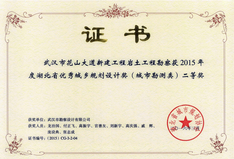 花山大道新建工程巖土工程勘察獲2015年度湖北省優(yōu)秀城鄉(xiāng)規(guī)劃設(shè)計(jì)