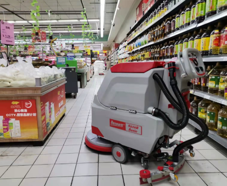 因?yàn)槌蓄櫩投啵鶕?jù)地面面積及通道寬度等現(xiàn)場(chǎng)不同的環(huán)境,可以選擇手推式洗地機(jī)或者駕駛式洗地機(jī),通常超市常見的洗地機(jī)是手推式洗地機(jī),它能高效清洗,又不耽誤顧客看貨。